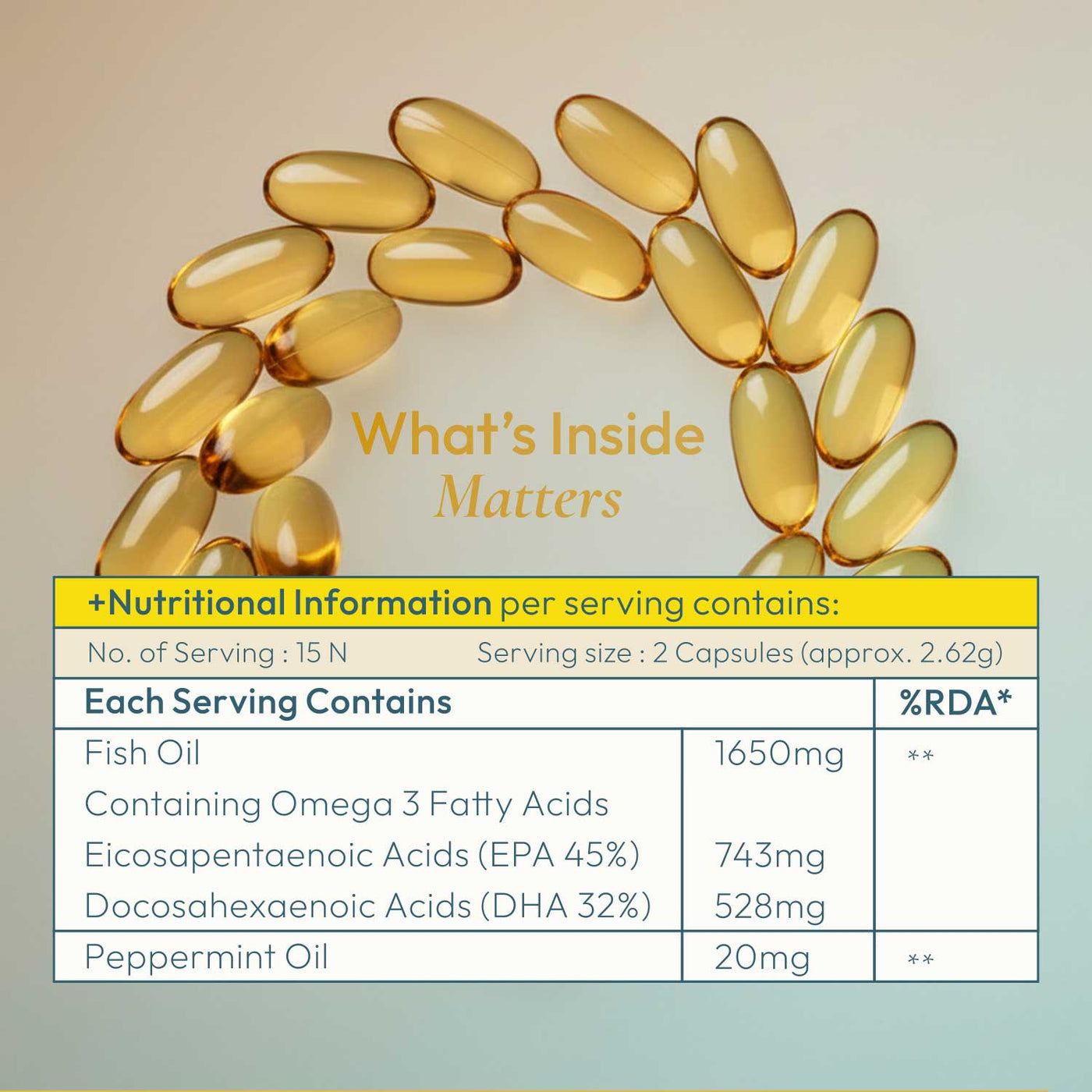 Our Omega-3 fish oil supplement supports cardiovascular health by maintaining healthy triglyceride levels & cholesterol balance. In addition, it also helps improve brain and memory functions, strengthens immunity, boosts bone and joint health and supports overall emotional well-being.