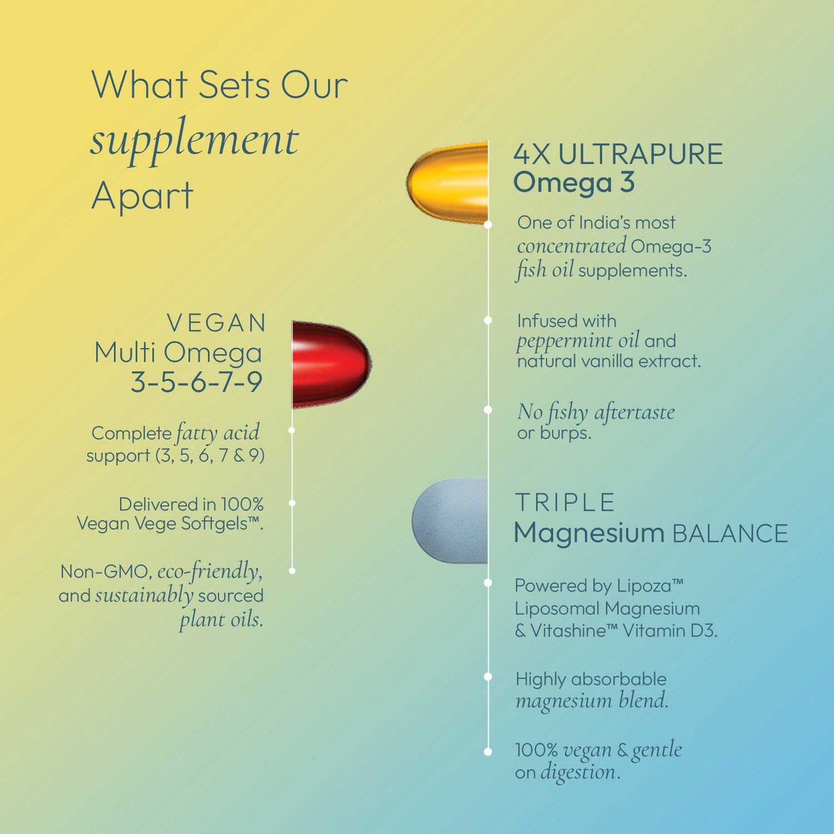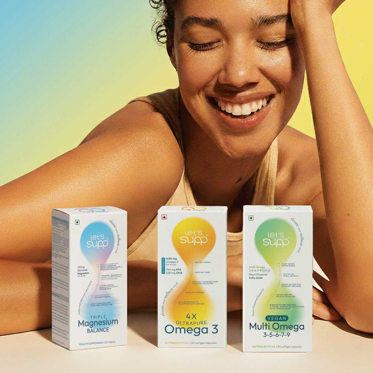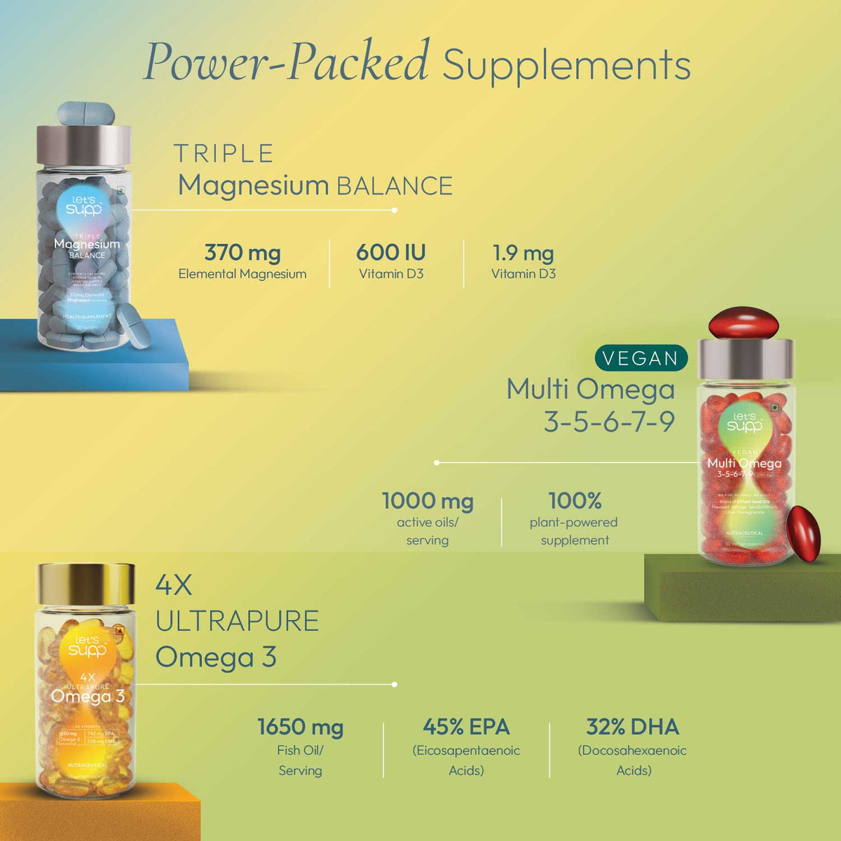 Let’s Supp’s Vegan Multi Omega 3-5-6-7-9 and Triple Magnesium Balance are 100% plant-based wellness essentials, perfectly suitable for vegans and vegetarians. The 4X Ultrapure Omega-3 capsule, on the other hand, is a fish oil supplement.