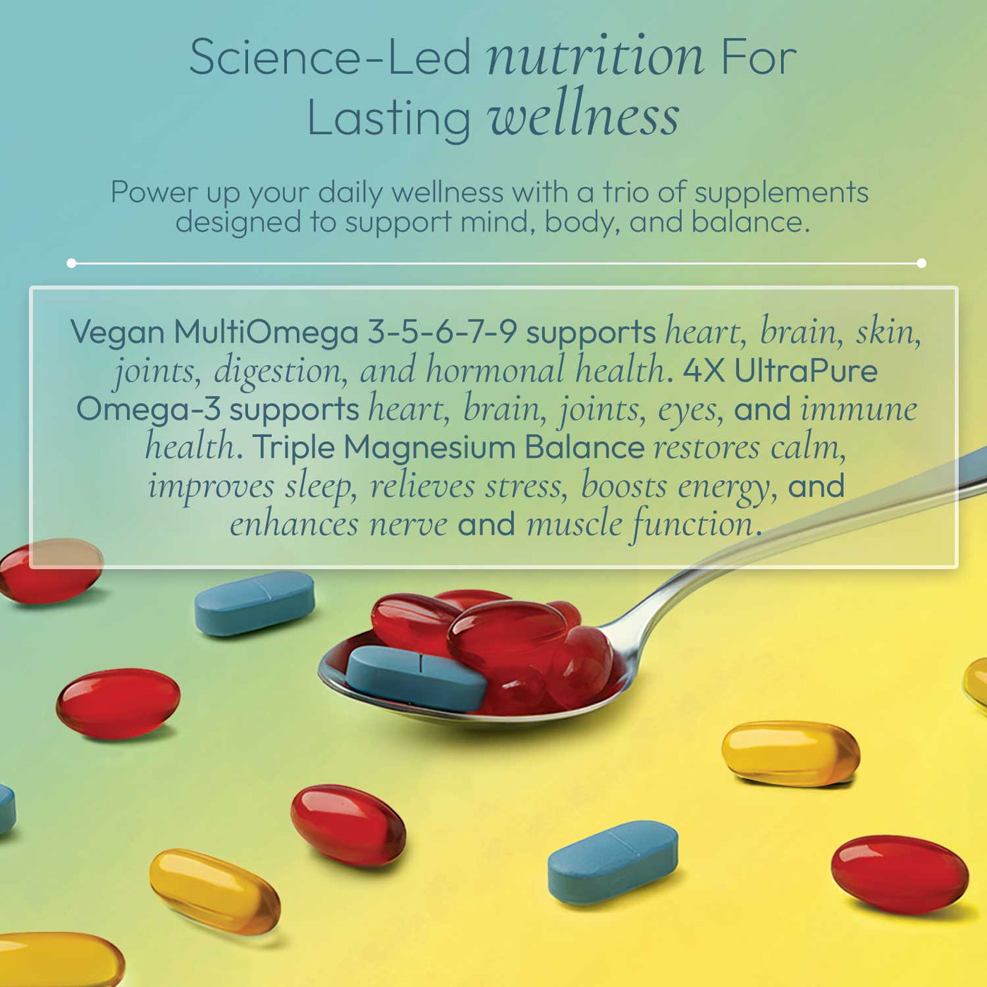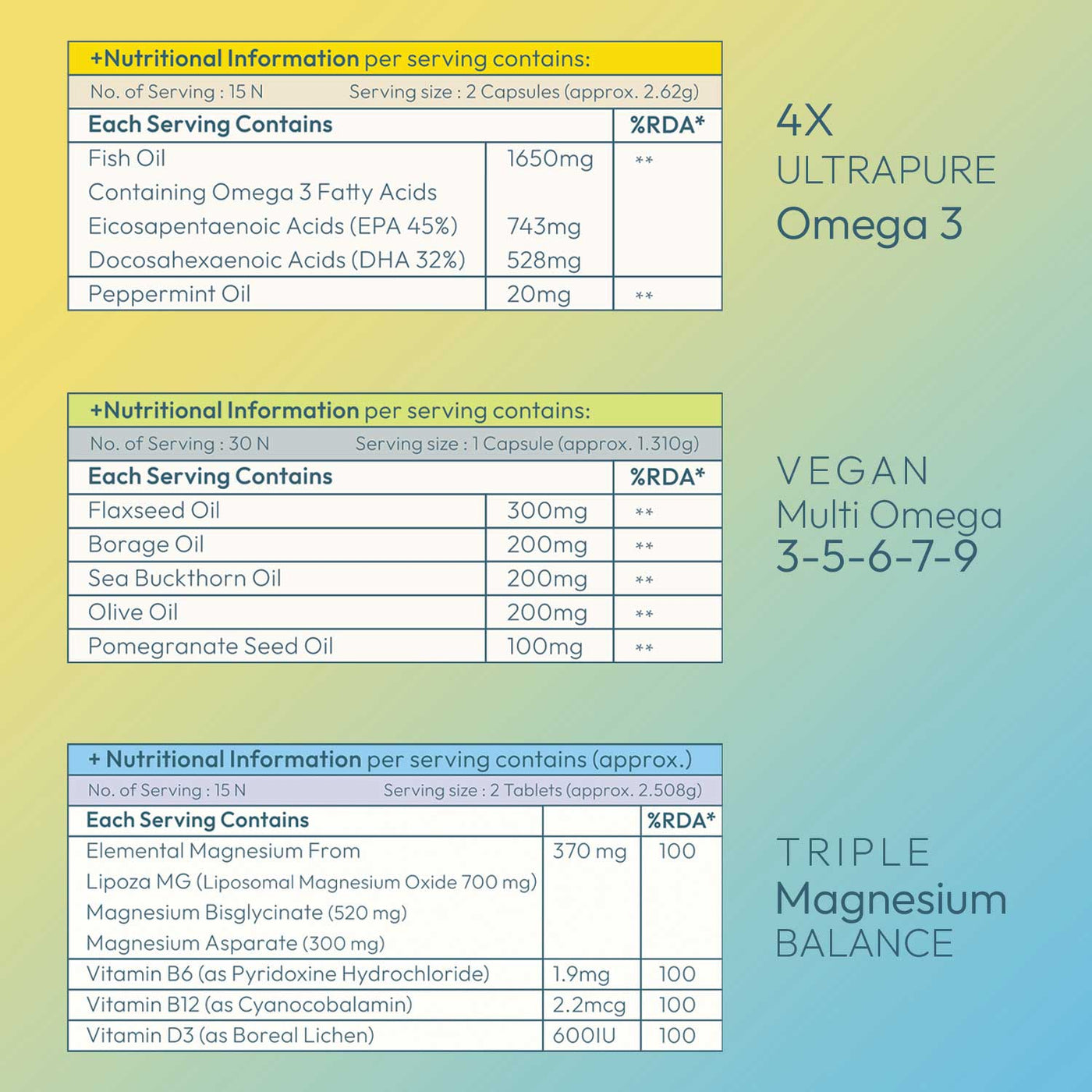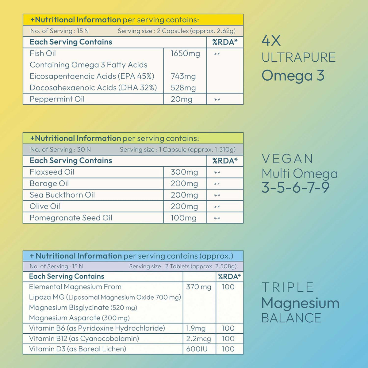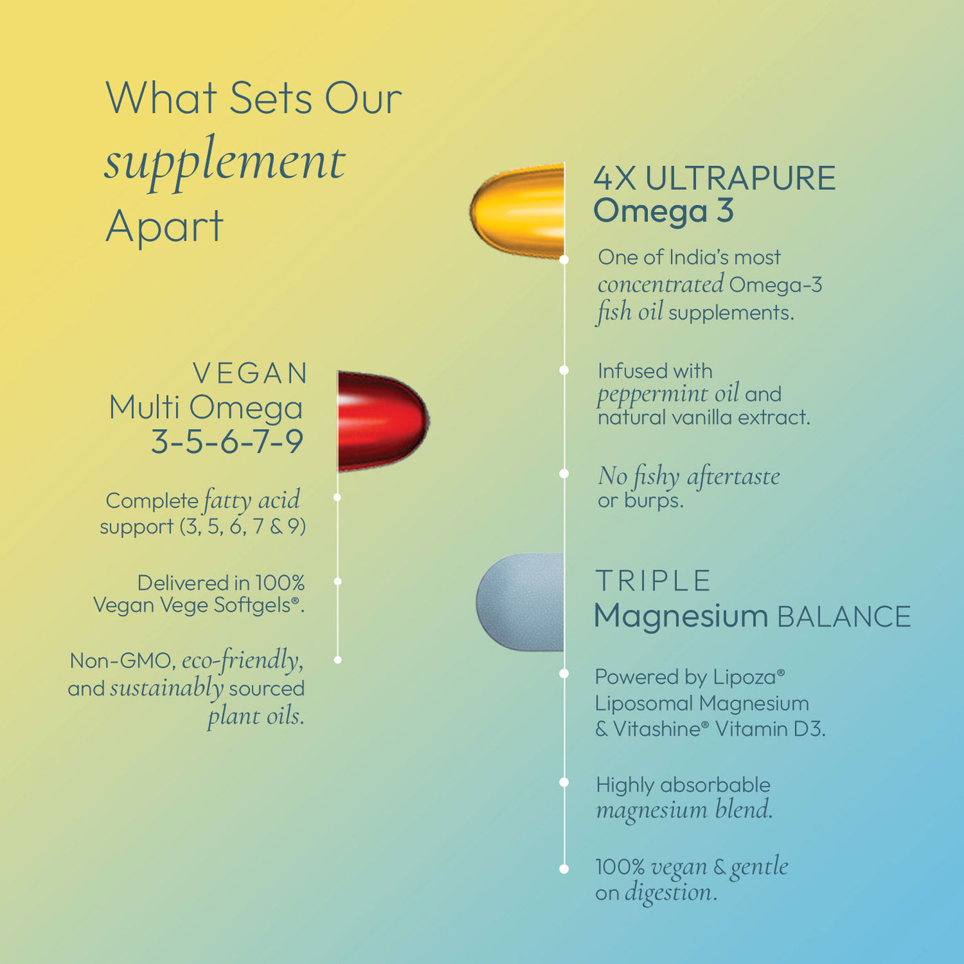 Let’s Supp’s Vegan Multi Omega 3-5-6-7-9 and Triple Magnesium Balance are 100% plant-based wellness essentials, perfectly suitable for vegans and vegetarians. The 4X Ultrapure Omega-3 capsule, on the other hand, is a fish oil supplement.