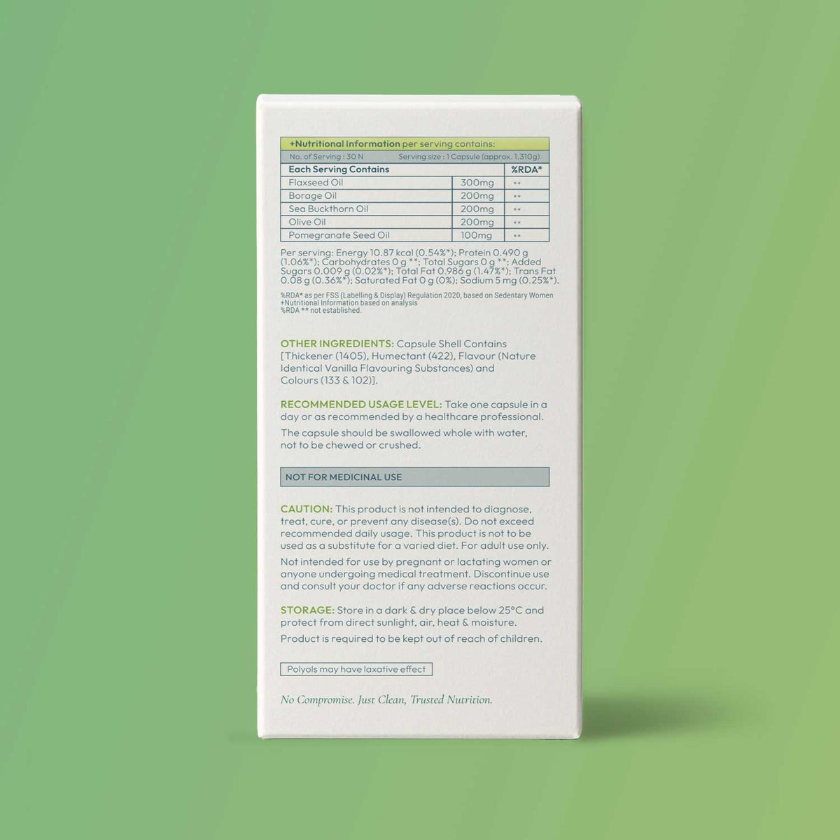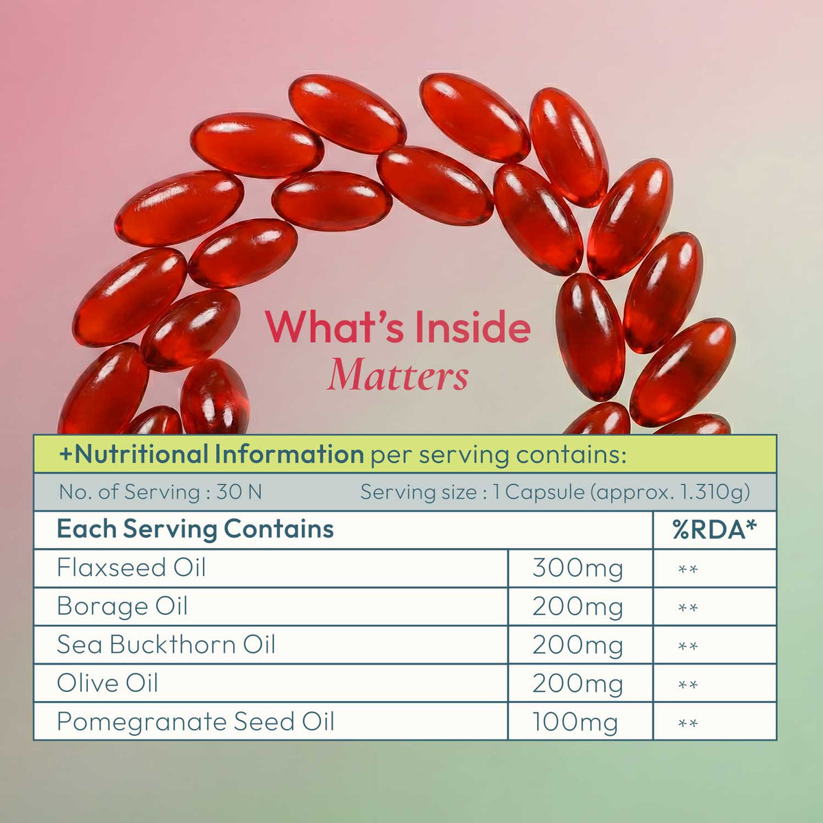 Yes! This supplement contains ingredients like Sea Buckthorn oil (Omega-7), Pomegranate Seed Oil (Omega-5) and Borage oil (Omega-6), which are beneficial for your skin and hair health. Together, they nourish and hydrate your skin, help maintain its elasticity, protect it from damage by free radicals and the environment and reduce irritation and redness. The three oils also help hydrate your scalp and nourish hair follicles so that your hair becomes healthier, shinier and stronger.